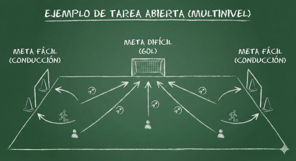 En lugar de un ejercicio analítico (fila india, tiro a puerta), diseña juegos donde el éxito tenga varios caminos.