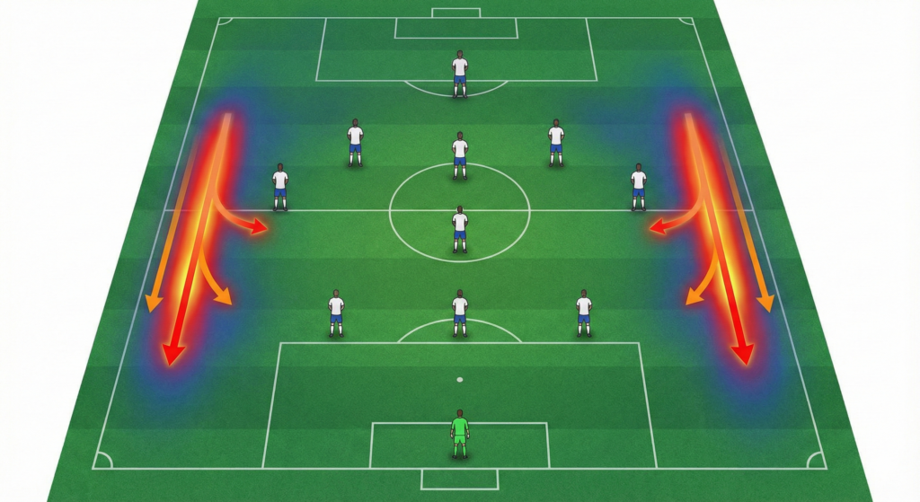 Los mediocampistas de banda en este sistema tienen la carga cognitiva más alta. Deben procesar dos estímulos opuestos constantemente: