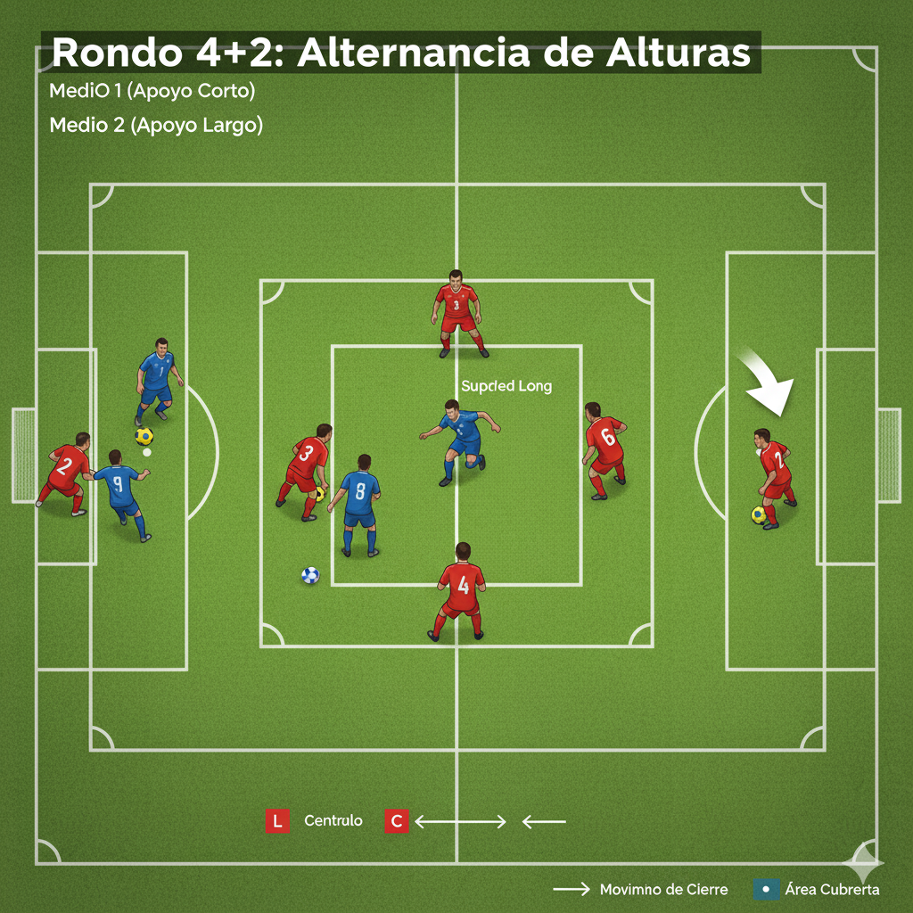 - Tarea Clave: Rondo 4+2 en Medio Campo. Cuatro atacantes con un Central y un Lateral en la línea de fondo. El «2» central solo puede recibir si se coloca en una línea diferente a su compañero. Si ambos están paralelos, el pase es anulado.