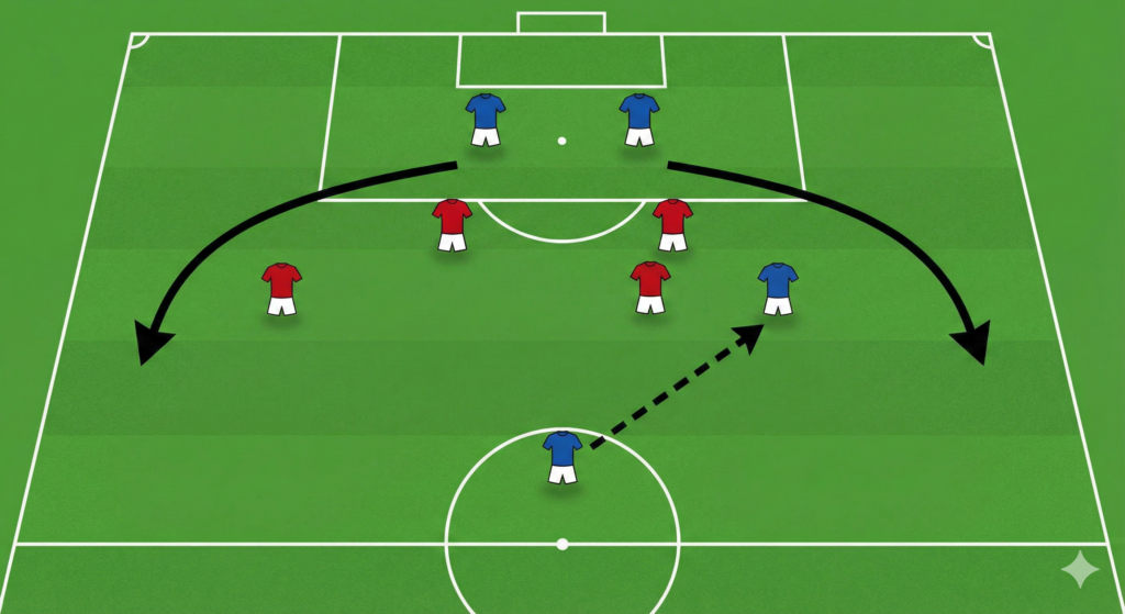 - Densidad Central: Acumulamos 4 jugadores en el carril central (2 medios + 2 puntas), lo que nos da superioridad numérica casi automática en la zona de creación y finalización.