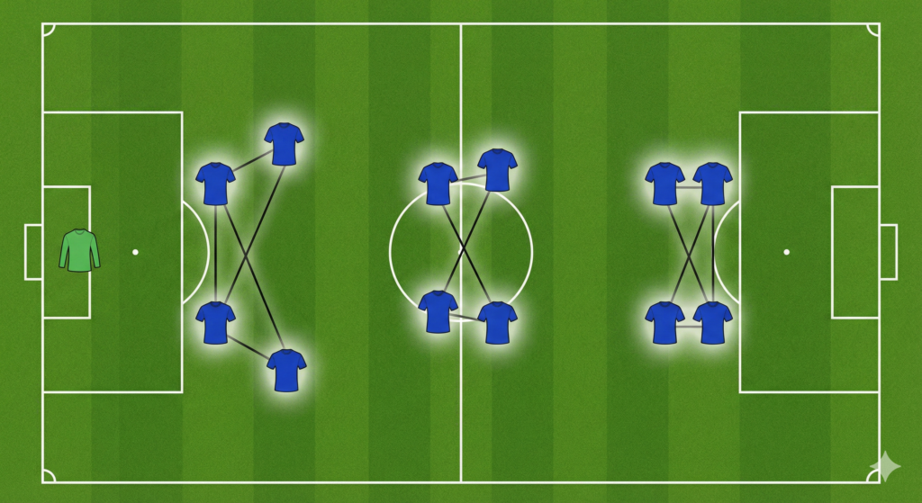 Desde la perspectiva del Entrenamiento Estructurado (escuela Barça/Seirul·lo), el fútbol es interacción. El 1-2-2-2 es el sistema perfecto para trabajar las Micro-Sociedades o parejas funcionales.