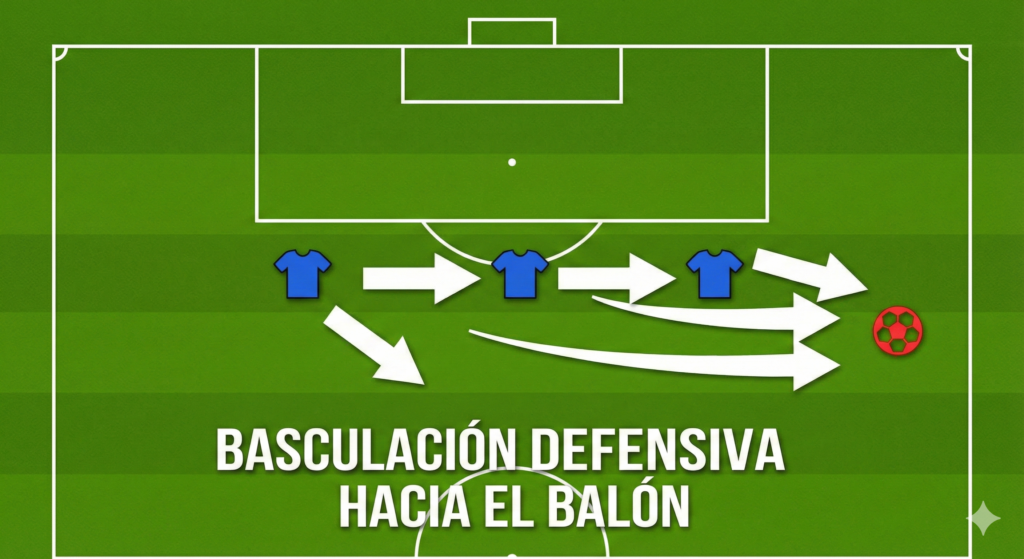 Descripción: Gráfico táctico que ilustra el movimiento coordinado de los tres defensas (basculación) hacia la banda donde se encuentra el balón para cerrar espacios y evitar ser superados por el centro.