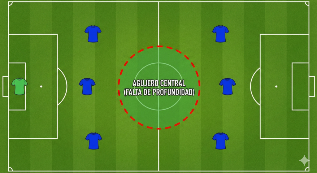 Al haber mucha distancia entre la línea defensiva y la ofensiva, se crea un «agujero» en el medio campo. El equipo rival puede aprovechar ese espacio.